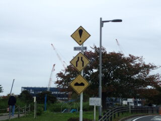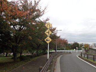 葛飾区東立石緑地公園。派手な三連標識が連続している。